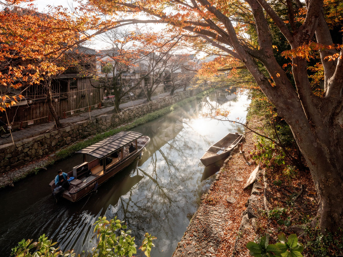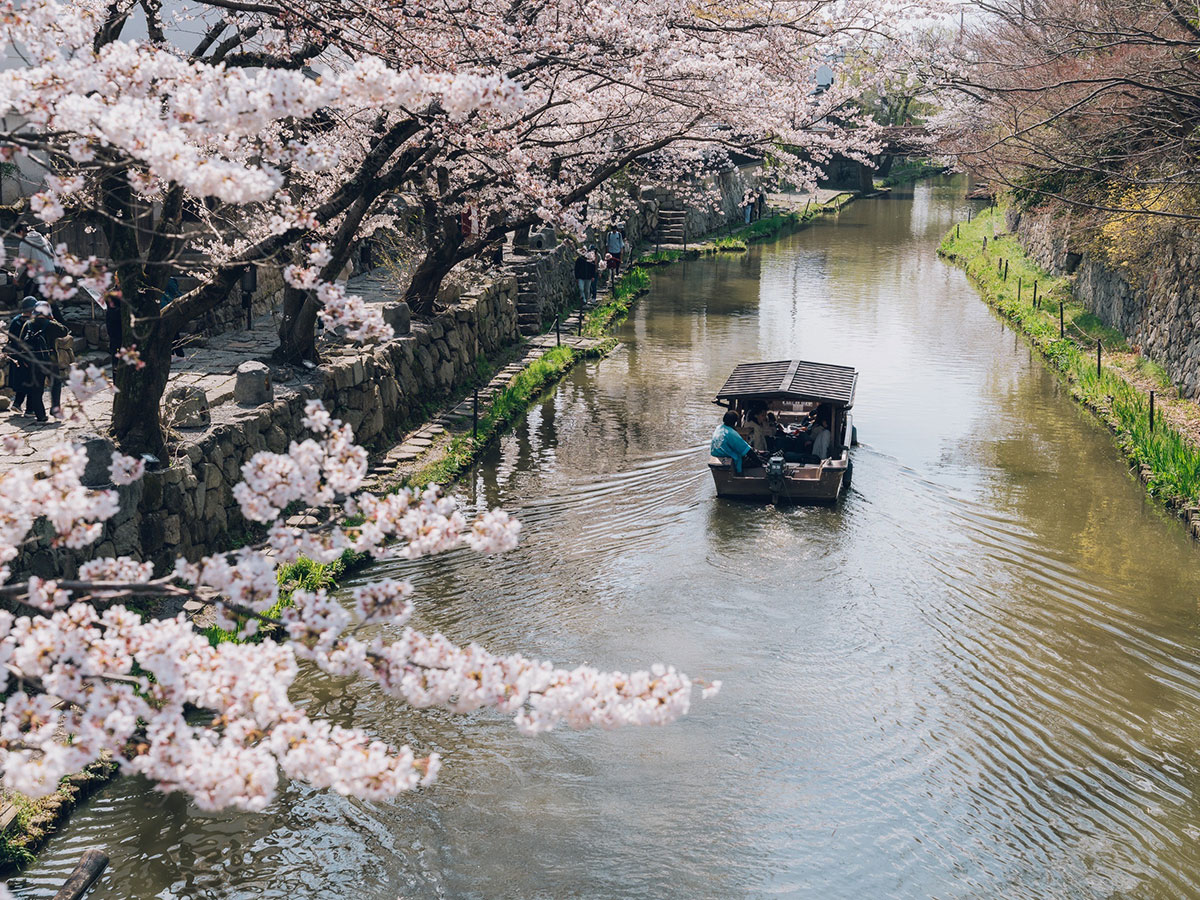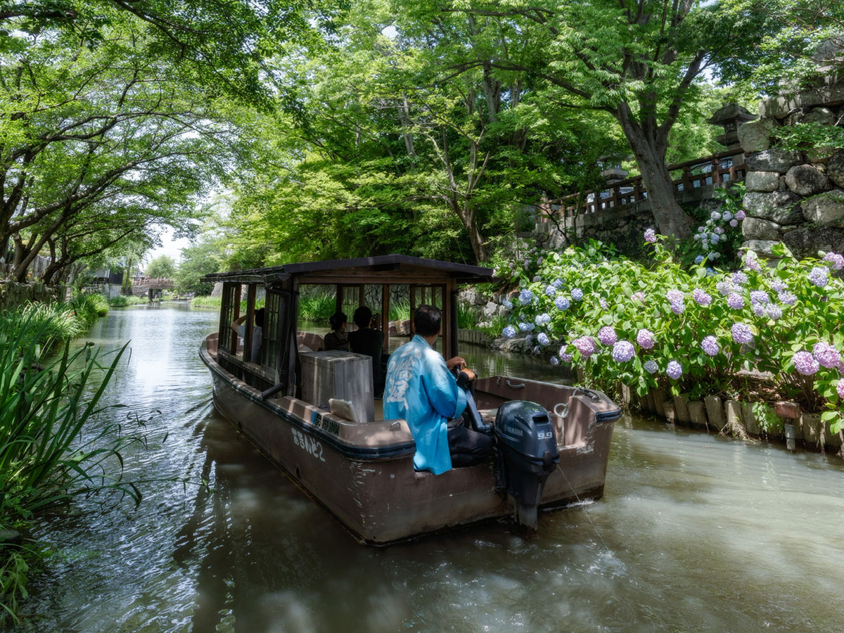 Please leisurely enjoy the peaceful and atmospheric scenery of Hachiman-bori, lined with white-walled storehouses, from aboard a traditional Japanese boat.